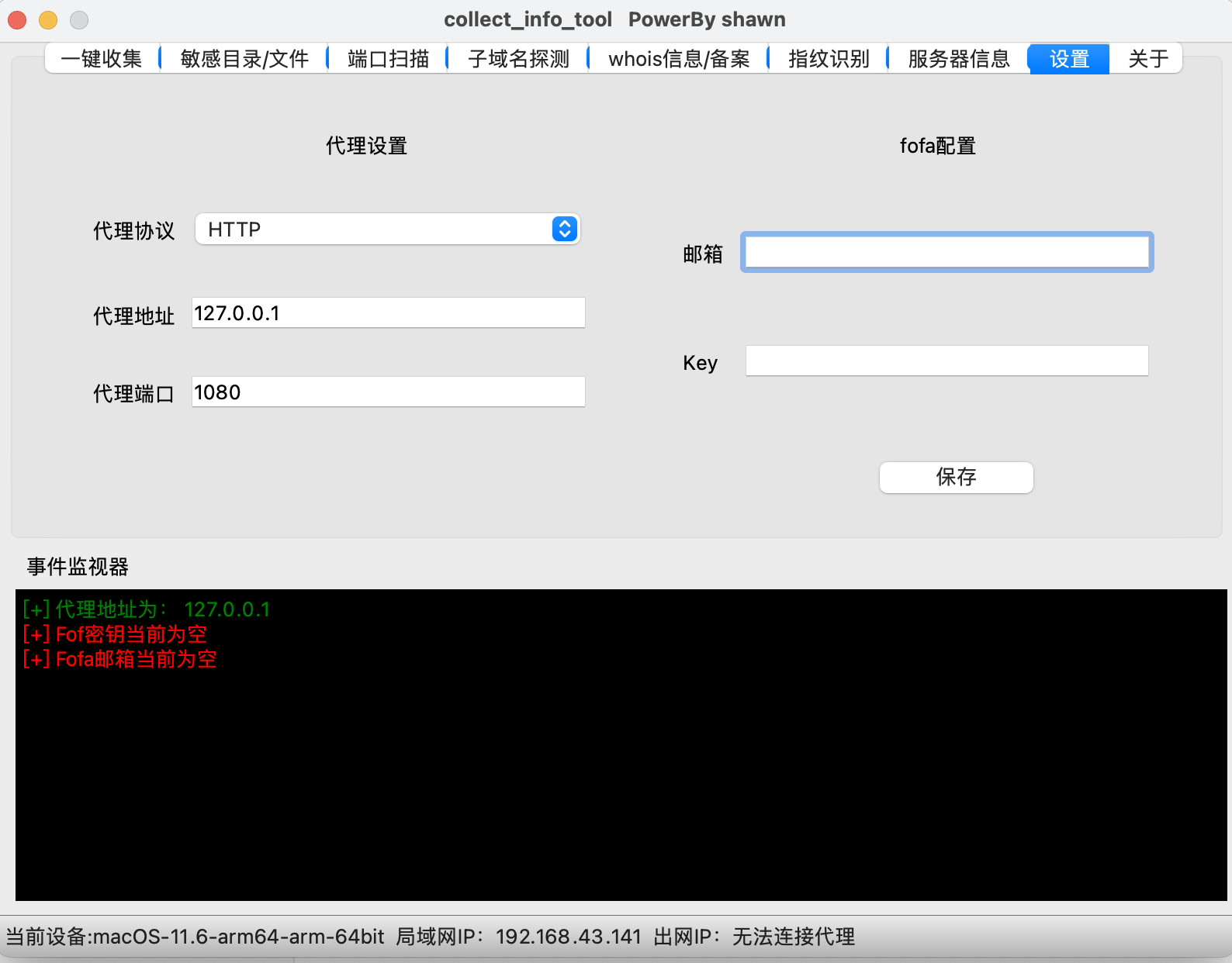 在设置中可以添加代理配置,使用网络代理流量,直接连接服务器的UA头进行随机化。工具状态栏支持显示系统OS,内网IP,代理出口IP